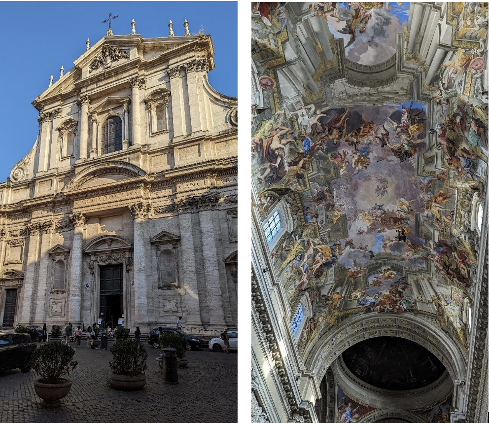 A második nagy jezsuita templom építése 1626-ban kezdődött, összhangban azzal a jezsuita törekvéssel, hogy akatolikus hitet a művészetek és tudományok is támogassák, ezért kiváló művészeket bíztak meg az építésével. Egy barátom javaslatára látogattam meg a templomot, kifejezetten Andrea Pozzo mennyezetfreskójának megtekintésére, amely Szent Ignác megdicsőülését ábrázolja. Mivel a négyezetet ebben a templomban nem fedte kupola, Pozzo mennyezeti freskója révén olyan térhatást alkotott, amely által a síkban lévő mennyezet az illuzionista festészet eszközeivel fénnyel teli kupolát teremt a templom fölé. Pozzo kerek, feliratos követ fektetett a padlóra, így jelezte azt a helyet, ahol a szemlélő a legjobban átélheti a szimulált tér hatását, melyben a perspektíva segítségével a valódi ésa festett tér határai összeolvadnak. Szomorú tény, hogy erre a helyre egy ferde tükröt helyeztek a látogatók szórakoztatására, amelyből visszatekintve fotót készíthetnek saját magukról az illuzionista tér előtt állva. A kígyózó sor nem tette lehetővé, hogy a Pozzo által megjelölt pontról megcsodálhassam a látványt, ámde az élmény más pontról tekintve is tökéletesen érezhető.