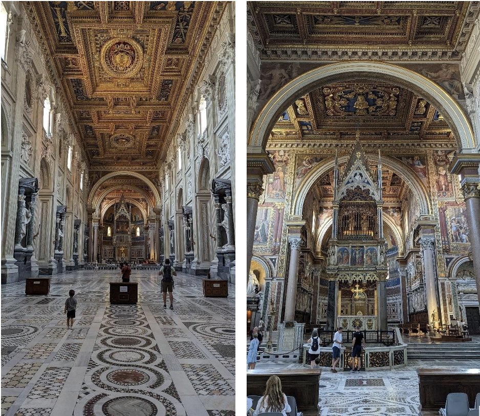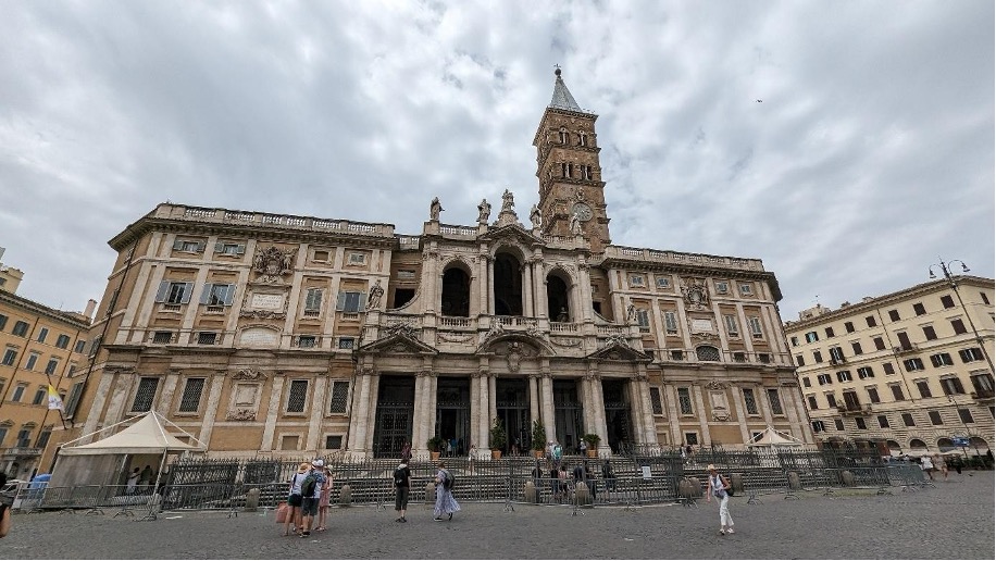 Egyetemi tanulmányaim során a római Santa Maria Maggiore templom kiemelt figyelmet kapott. Művészettörténettanárom hosszan elemezte az épületet, ezért kihagyhatatlan volt meglátogatni Róma hét zarándoktemplomának és négy patriarkális bazilikájának egyikét, ami a legnagyobb és legkiemelkedőbb Szűz-Mária kegyhely. Történeteegészen a IV. századig nyúlik vissza, ugyan akkor még egy kisebb épület állt mai helyén. Liberius pápa látomása Szűz Máriáról eredményezte, hogy az Esquilinus legmagasabb pontján templom épült. Nevezetessége az V. századból származó mozaikdíszítés. Az apszis és a kereszthajó a XIII. század végén épült, a kétemeletes barokk homlokzat és a széles lépcsősor pedig a XVII. században. Különlegessége a Capella Sistina, amelyben a kis Jézusnak tartott jászolmaradványait (1298 k.) és egy XVI. századi Madonnát őriznek. A földalatti kápolna Arnolfo di Cambio munkája.