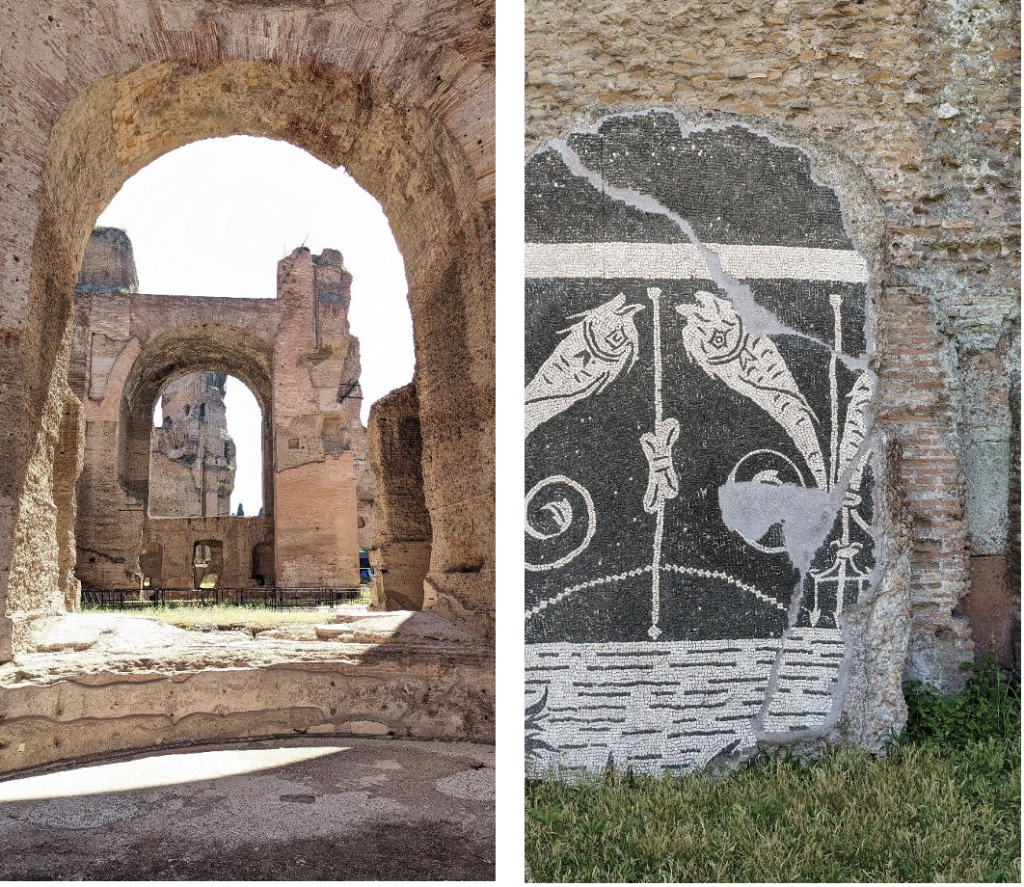 Caracalla 217-ben egy hatalmas komplexumot építtetett 11 hektáron, melynek csak a fürdőcsarnokában 1600 ember fért el. A romok jó állapotban fennmaradtak, bent sétálva képünk és fogalmunk lehet a csarnokok elhelyezkedéséről és azokról az elképesztő dimenziókról, amelyről a monumentális épületek maradványai tanúskodnak. Egykoron a falakat mozaikok, freskók és márvány borította, a termek egymásutánja lenyűgöző volt. A valaha volt sok csodásszoborból a Farnese bikát és Farnese Herculest mindenképp érdemes említeni. A vizet nyolcezer köbméteres, hatalmas ciszternákban tárolták, a műszaki egységek a pincében voltak, ahol a föld alatti utcák szabályos hálózatát alakították ki. Több csapás is érte a fürdőhelyet, azonban a legnagyobb az volt, mikor III. (Farnese) Pál a Saint Pietro újjáépítéséhez kőbányává változtatta a területet. Jelenleg is látogatható, időszakos kiállítótérként is használják: látogatásomkor Letizia Battaglia olasz fotós és fotóriporter, kiállítása volt megtekinthető.