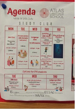 Az Erasmus hallgatói részére délutáni és hétvégi programokat is szervezett az Atlas. Első nap vezetett városnézésen voltunk, majd ír tánc bemutatón, ahol ki is próbálhattunk egy ír táncos koreográfiát, meglátogattuk a Rock ’n’ roll múzeumot, majd az első hetet egy teljes napos kirándulás zárta Howth gyönyörű félszigetére, a világítótoronyhoz. Második héten Bray-be és Kilkenny-be látogattunk el a nyelviskolával, és kulturális programként a Riverdande fantasztikus táncestjét láthattuk. Ezeken felül, mindig a hét elején, további speciális foglalkozásokra lehetett feliratkozni, pl. nyelvtani gyakorló, önéletrajz írása, kommunikációs tréning, ír kultúra, zenei program, nyelvvizsga felkészítés. Volt, hogy egy másik kurzus irodalmi városi sétájához is kapcsolódni tudtam, rugalmasan kezelték a jelentkezéseket. A tanáraink és a recepciós lányok is mindig készségesen segítettek, ha kérdésünk volt. Már első nap részletes tájékoztatást kaptunk a teljes kintlétünkről. A két hét alatt öt tanár tanított, akik négy országból származtak, a hallgatók a világ minden részéről érkeztek (pl. Chile, Mexikó, Japán, Korea, Spanyolország, Németország, Olaszország), így számos kultúra találkozott egymással, csoportomban egyedüli magyar voltam. Többekkel is tartom a kapcsolatot a képzést követően is.